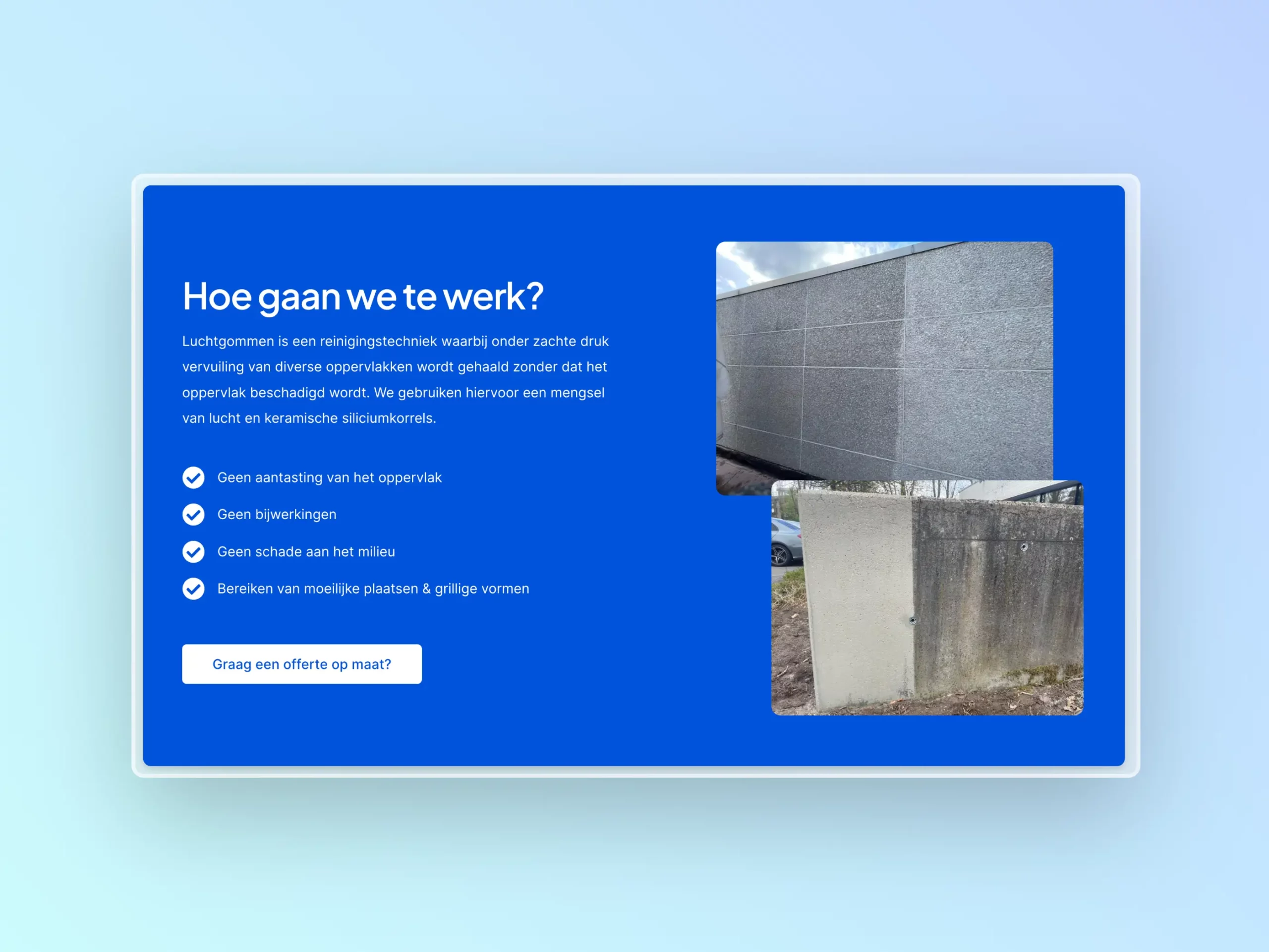 Hoe geef je zo’n schoonmaakdienst nu het beste weer op een website? Met voor & na foto’s! Zo zie je meteen het effect van de luchtgomtechniek. Dit maakt het visueel aantrekkelijk en laat de bezoeker zien wat het resultaat is.