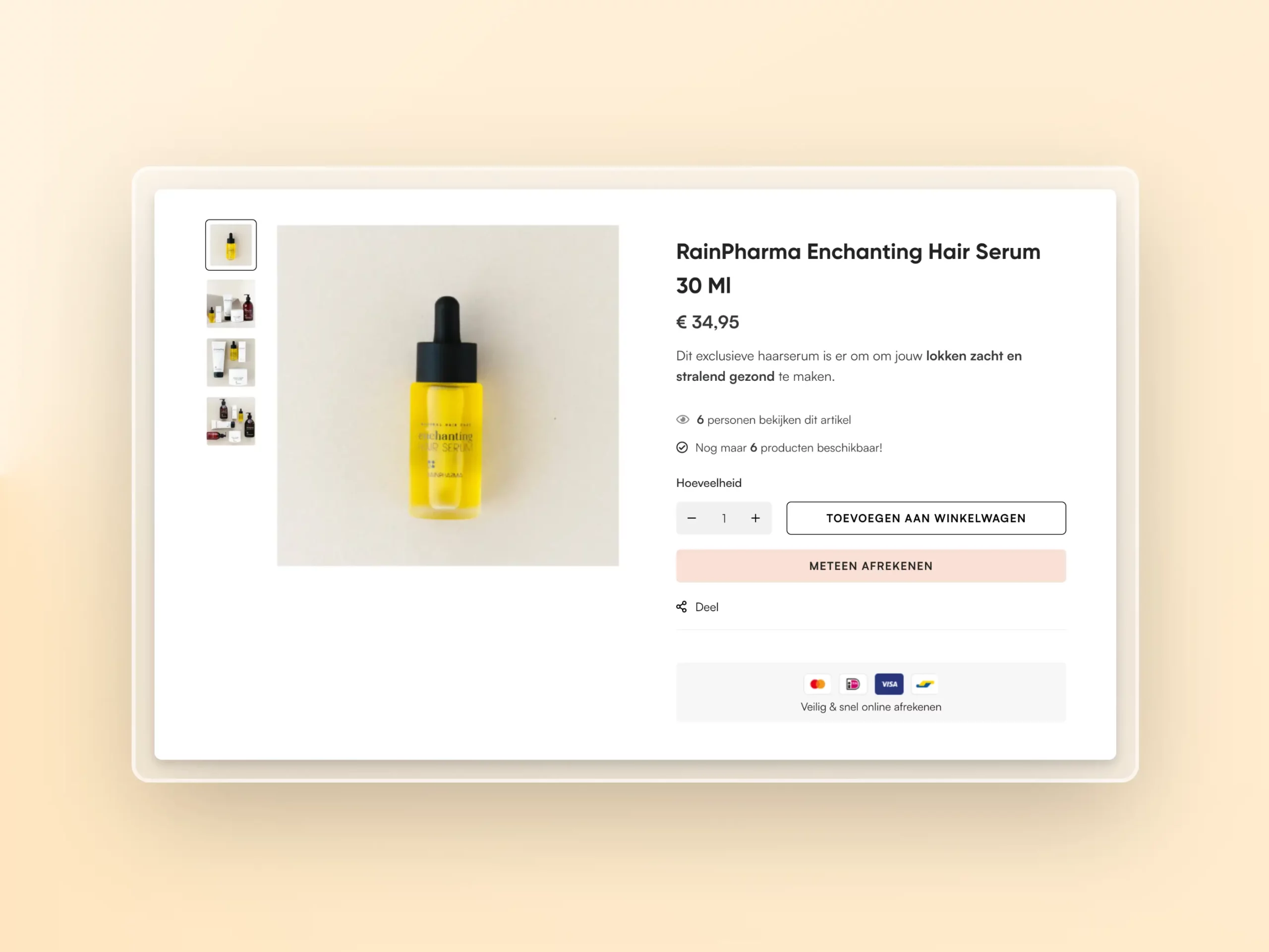 De productpagina zouden we echt als clean omschrijven! Een knappe, minimalistische lay-out met alle aandacht voor het product. Verder voorzien we een overzicht van de betalingsmogelijkheden. Dit verhoogt de conversie.