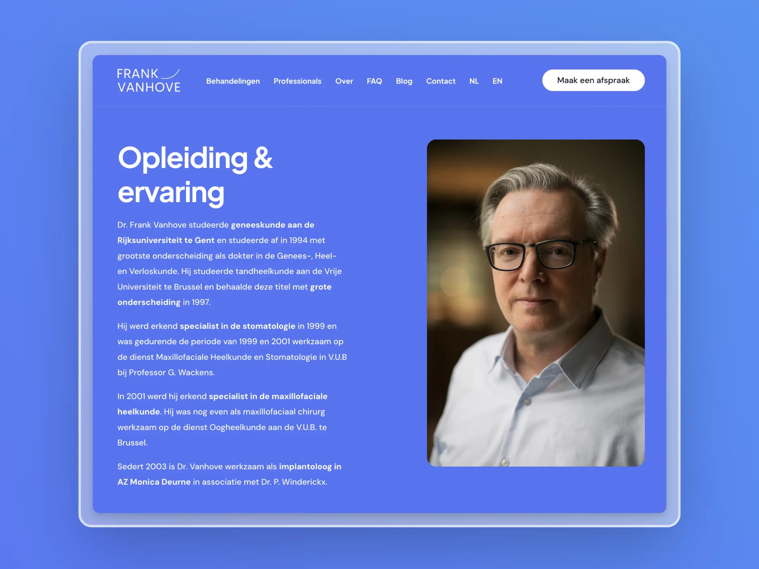 Daarom vonden we het belangrijk om een personal touch te geven aan de site. We bespreken Dr. Vanhove zijn geschiedenis, ervaring en voegen een foto toe zodat potentiële patiënten weten bij wie ze terecht gaan komen.