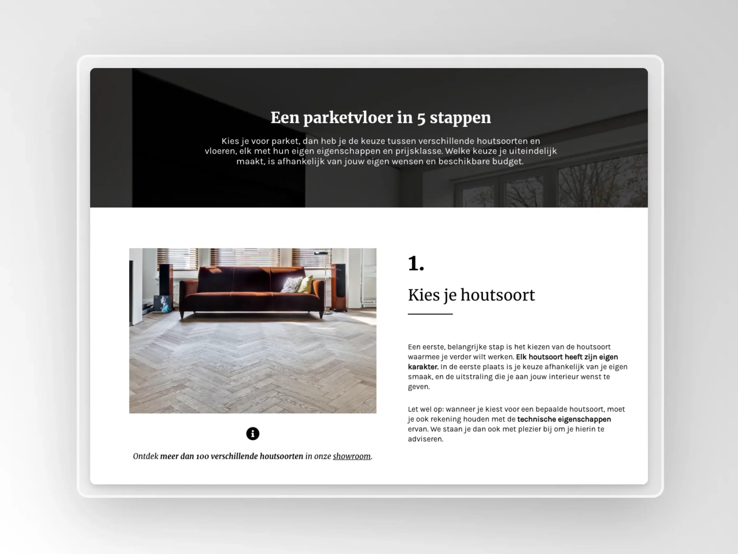De website van F&T Parketvloeren maakt de keuze van een nieuwe vloer een fluitje van een cent. Via een eenvoudig en duidelijk stappenplan, begeleid door relevante foto’s en tekst, wordt het proces van het kiezen van de perfecte parketvloer tot een fijne en efficiënte ervaring gemaakt.