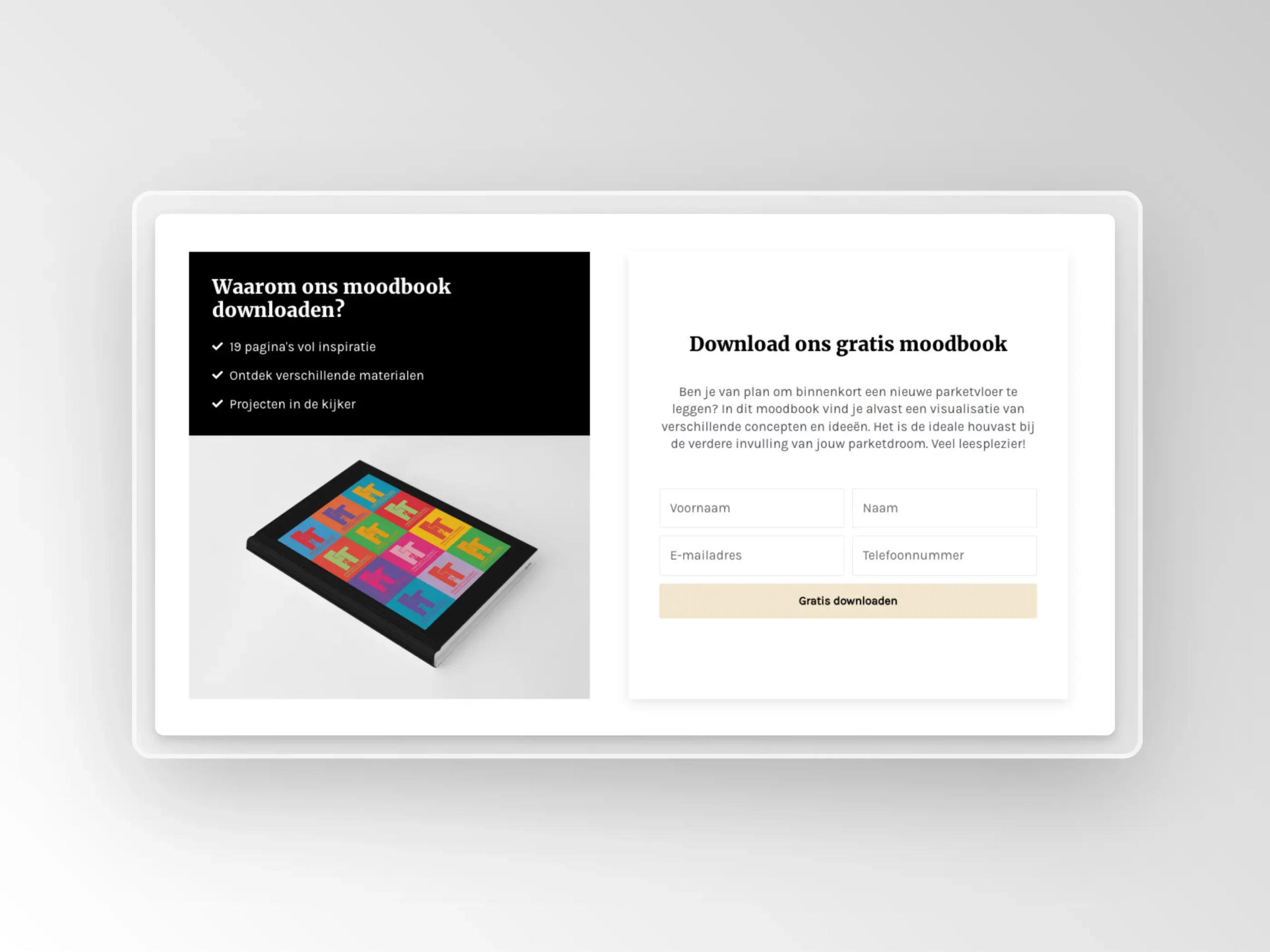 F&T Parketvloeren biedt een gratis te downloaden moodbook aan om bezoekers te inspireren bij hun keuze voor een parketvloer. Door hun contactgegevens achter te laten, krijgen ze toegang tot een rijke bron van ideeën, wat tegelijkertijd een effectieve manier is voor F&T om potentiële leads te genereren.