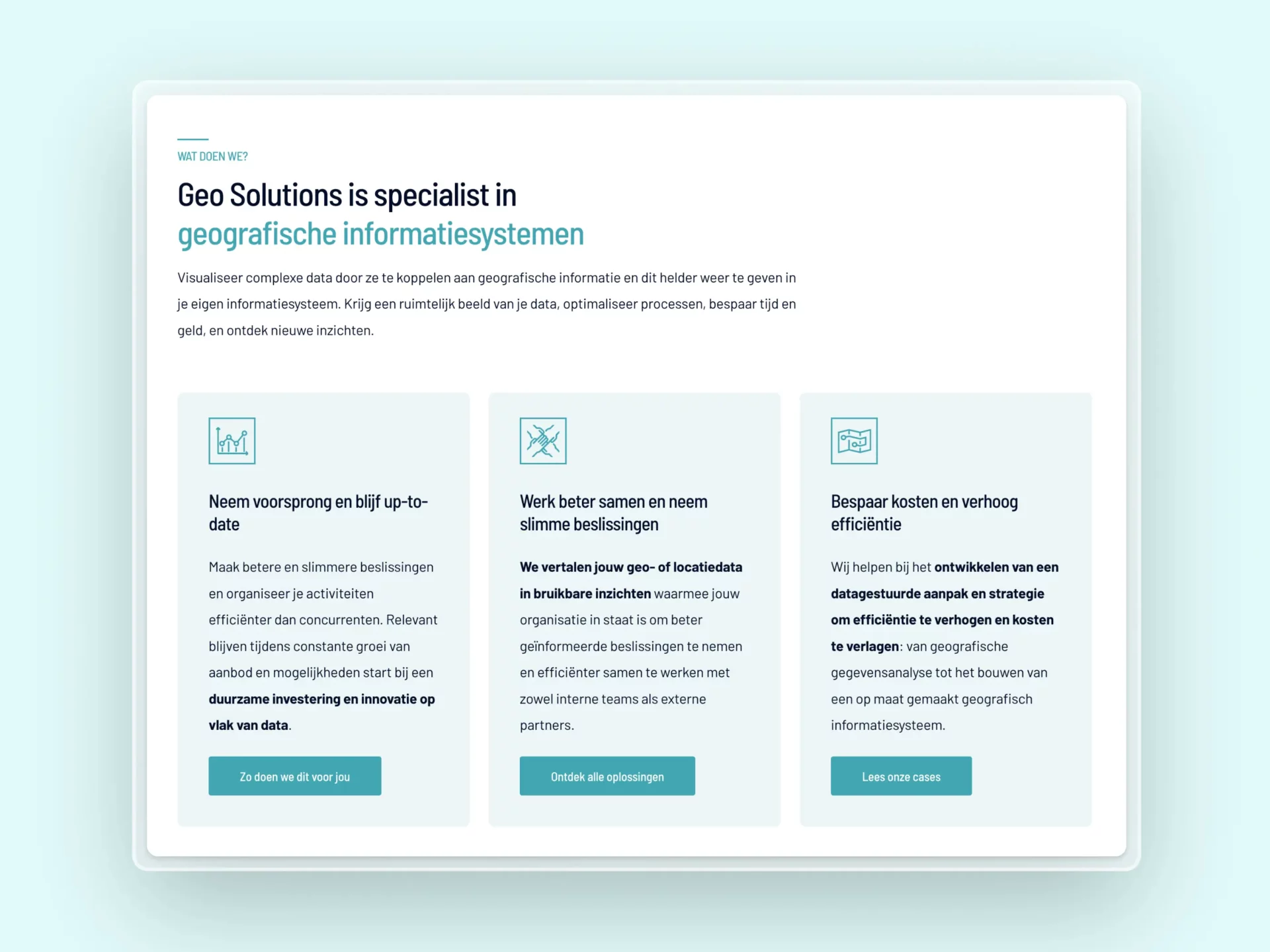 Geo Solutions is geen hippe start-up meer. Het bedrijf bestaat bijna 20 jaar en moest een zakelijke uitstraling krijgen. We integreren natuurlijk moderne toetsen, maar het mocht allemaal iets minder ‘flashy’ zijn.