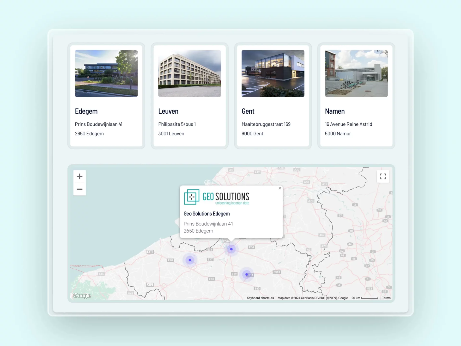 We integreerden een office locator met een dynamische kaart. Zo trekken we mooi de lijn door van de filosofie van Geo Solutions.