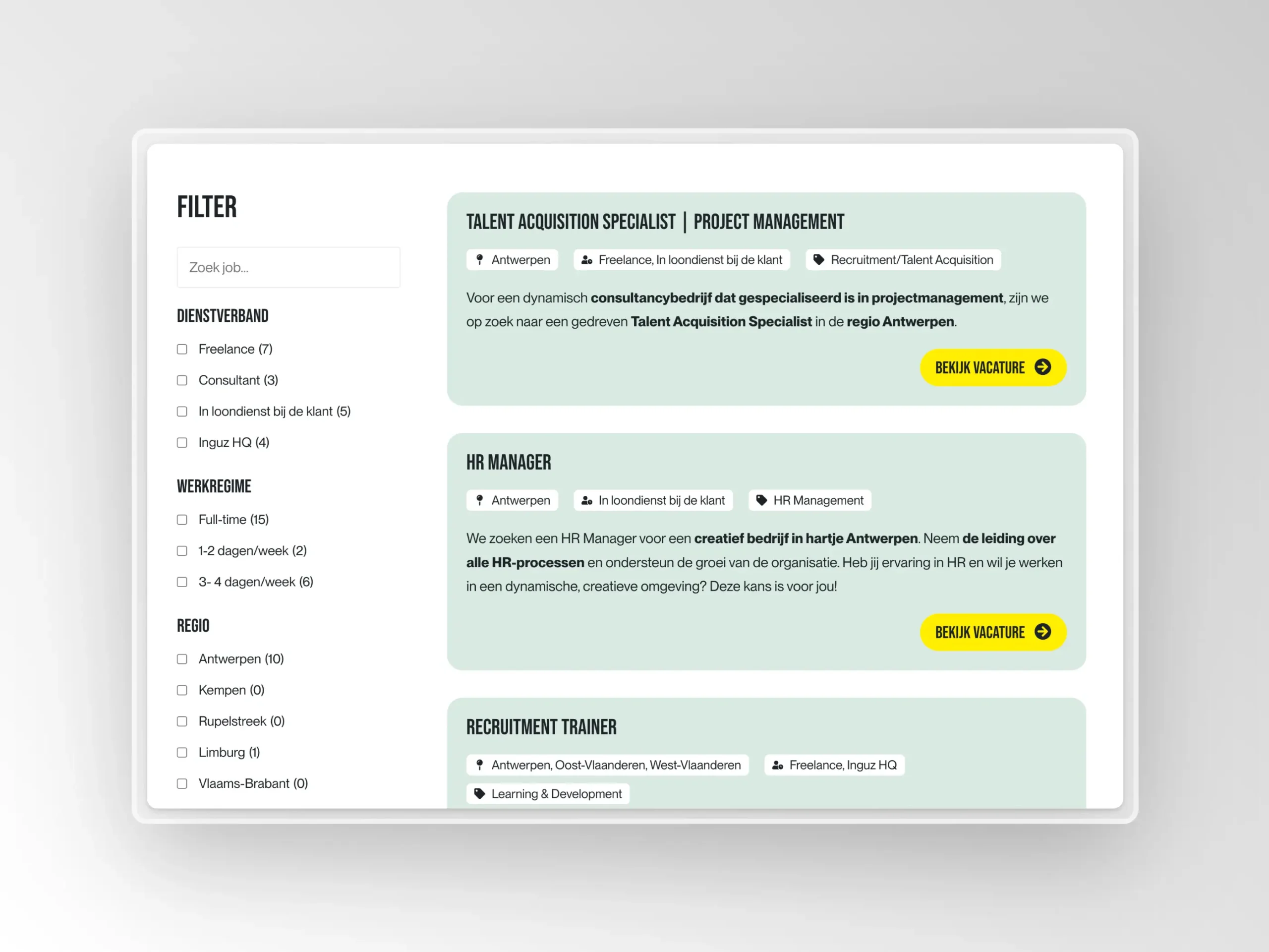 Voor een HR-website is het natuurlijk héél belangrijk om een goed vacature-systeem te hebben. We ontwikkelden dit in-house met meerdere filters en automatiseringen. Zo moet Fréderic maar op één knop duwen en de vacatures verschijnen overal op de site.
