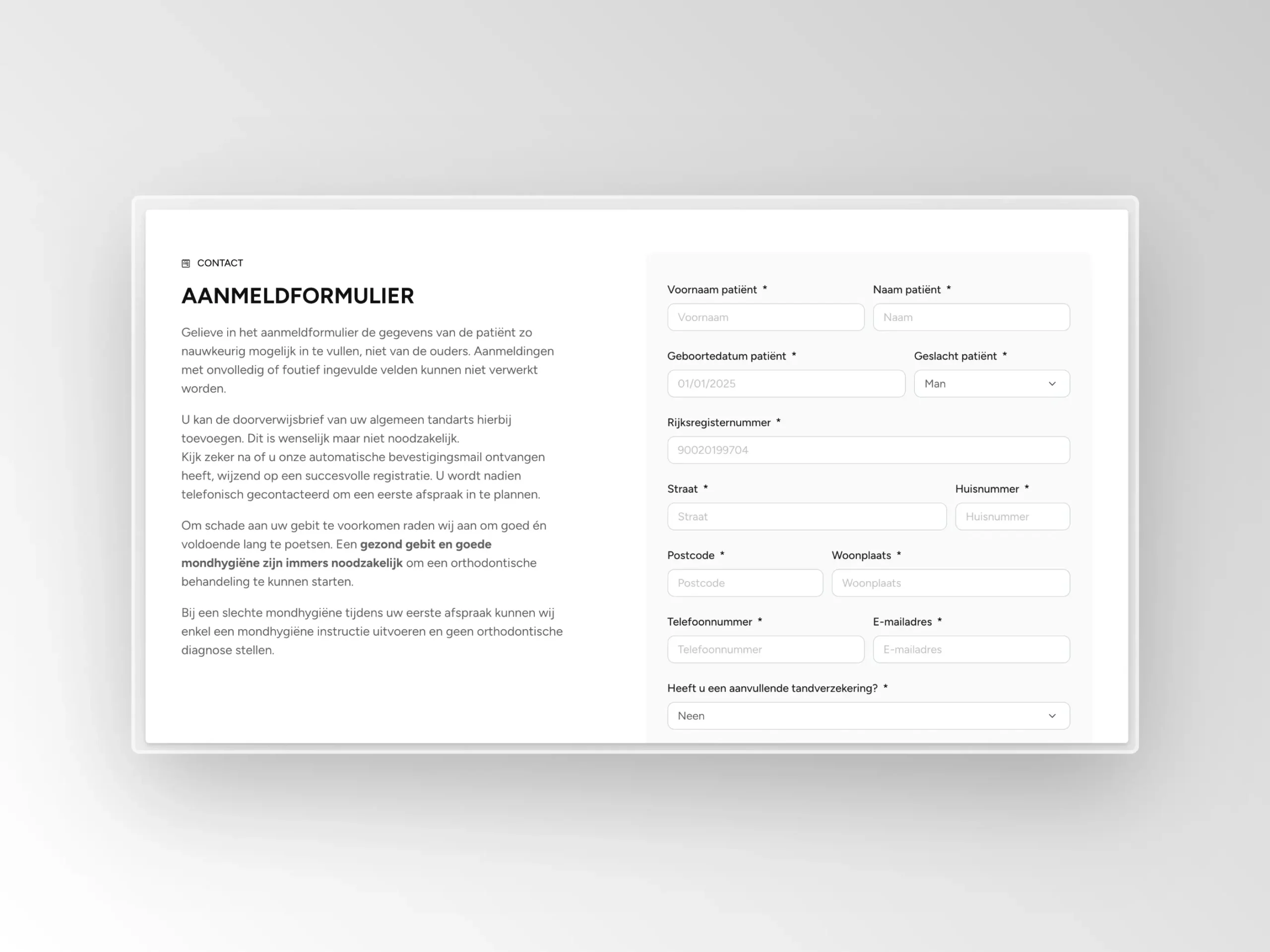 Bij een eerste afspraak heeft de arts veel informatie nodig. Nieuwe patiënten kunnen dit al makkelijk bezorgen via de website. Deze data koppelen we ook synchroon met een spreadsheet, zodat de praktijk dit snel kan organiseren.