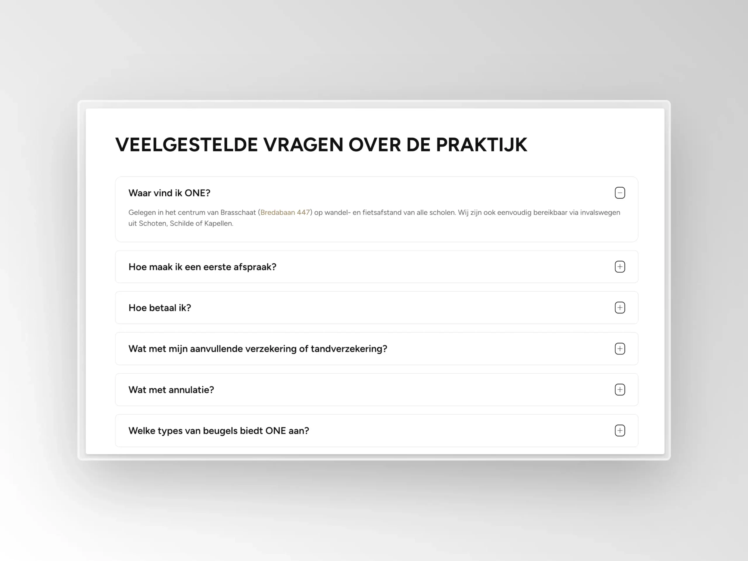 Door veelgestelde vragen toe te voegen op de website, scoren we binnenkort hoger in Google. Deze vragen en antwoorden kunnen snel indexeren, wat zorgt voor meer zichtbaarheid voor ONE.
