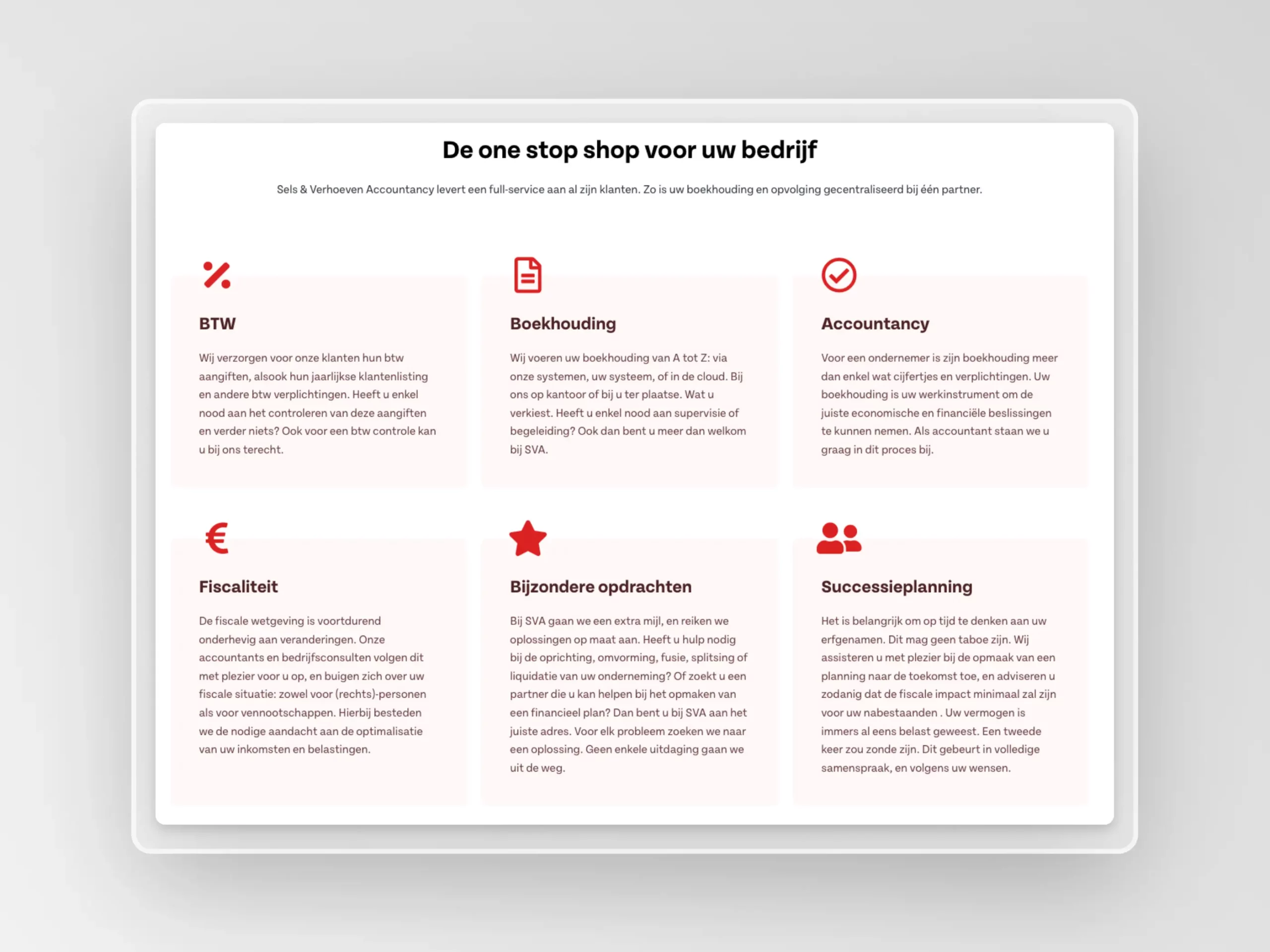 Op de homepagina van SVA krijg je meteen een duidelijk beeld van wat ze te bieden hebben. Elk van hun diensten is er overzichtelijk en helder gepresenteerd, zodat je meteen ziet welke ondersteuning ze kunnen bieden.
