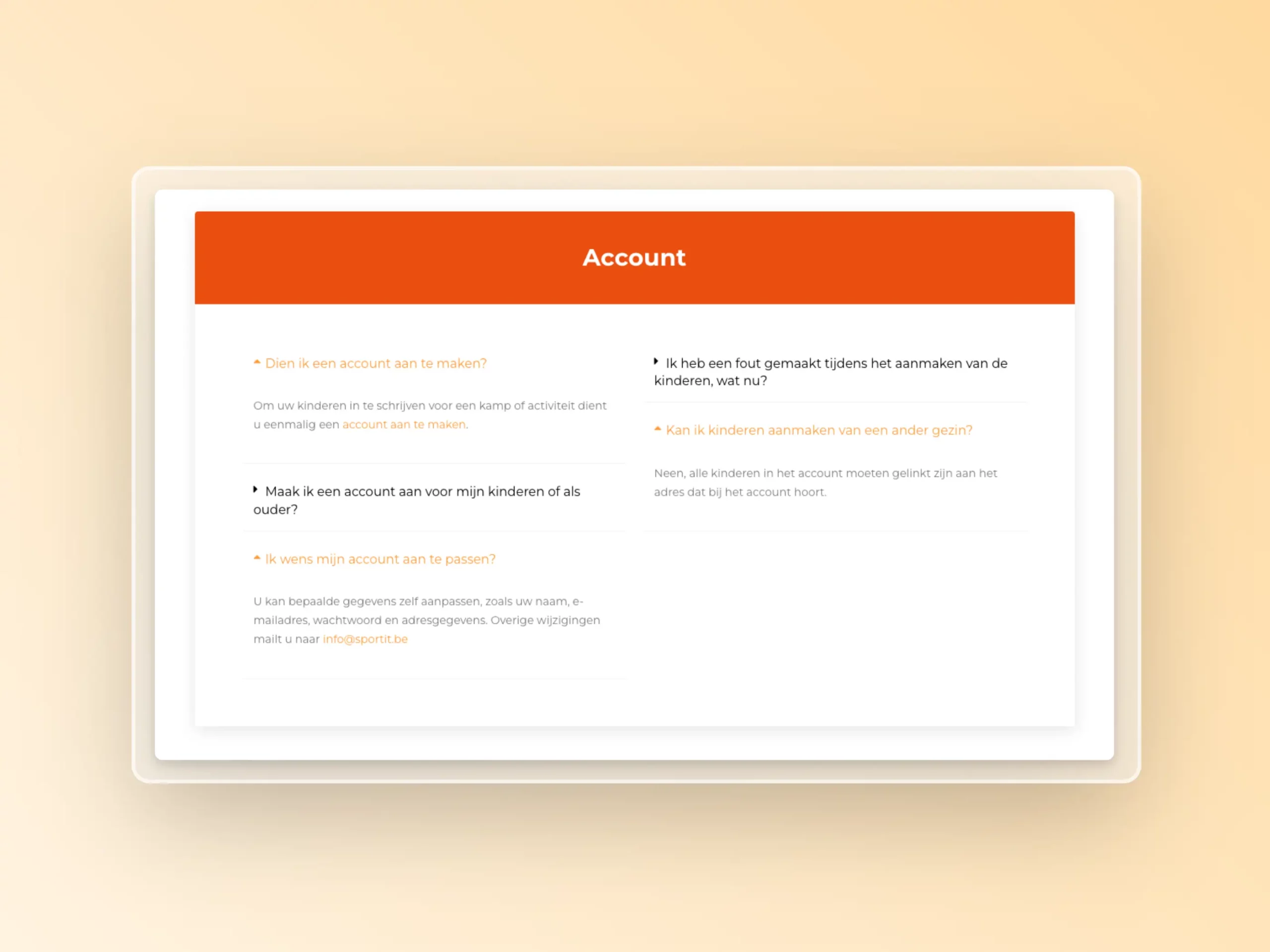 Heb je een vraag over de inschrijvingen, je account, attesten of annulaties? Op de FAQ pagina vind je een duidelijk en uitgebreid antwoord op al jouw vragen. Dit zorgt voor een zorgeloze ervaring, zowel voor de kinderen als de ouders.