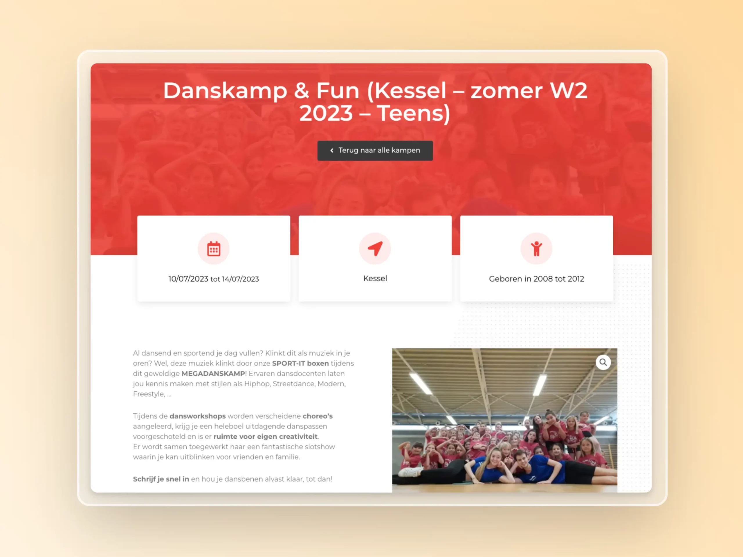 De informatieve kamppagina’s van SPORT IT geven ouders en kinderen een duidelijk beeld van wat ze kunnen verwachten. Elke pagina bevat essentiële details zoals de datum, locatie en leeftijd van de deelnemers, maar ook sfeerbeelden dankzij een uitgebreide fotogalerij. Daarnaast helpt het kleurenschema – uniek voor elk kampthema – bezoekers om in een oogopslag te zien of het kamp een creatief, actief of beleefkamp is.
